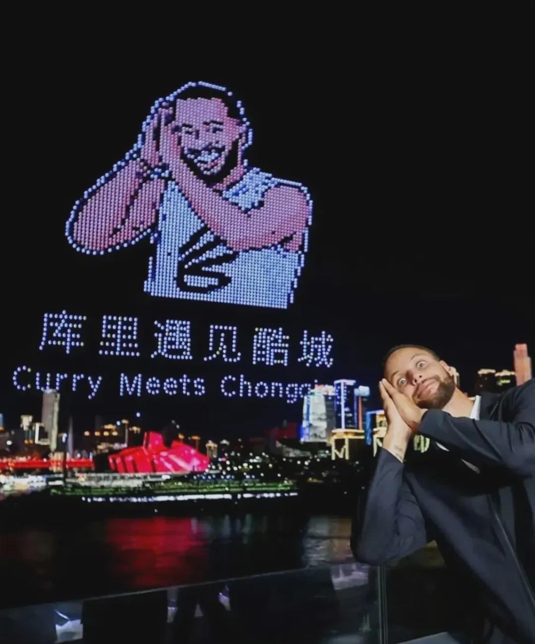 在活动开始前,就有“2号线库里涂装的单轨列车、川美黄桷坪校区的库里涂鸦一条街、巫山的库里涂装接驳大巴”等各种形式的宣传。在活动期间,重庆更是精心策划了5000架无人机空中表演,在朝天门两江交汇处上空,组成巨幅库里经典的“晚安“庆祝动作。
