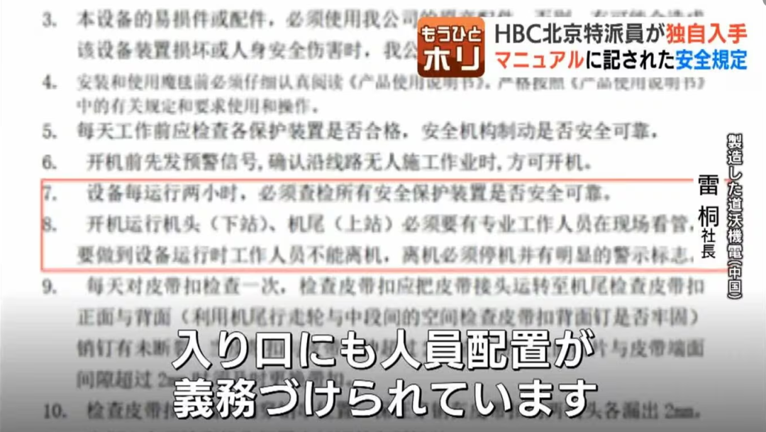 厂家老板面对采访直呼不可思议:“我们的手册上明确写着,入口和出口必须各站一名管理人员,且机器上有三层安全系统。如果按规程维护,这三层保险绝不可能同时失效。这六年里,我们没有收到过来自日方的任何报修反馈,甚至连一封询问保养的邮件都没有。”
