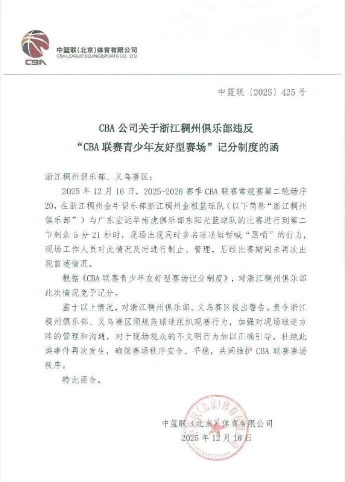 2025年12月16日,2025-2026赛季CBA联赛常规赛第二轮场序20,在浙江稠州金牛俱乐部浙江稠州金租篮球队(以下简称"浙江稠州俱乐部")与广东宏远华南虎俱乐部东阳光篮球队的比赛进行到第二节剩余5分21秒时,现场出现同时多名球迷短暂喊"黑哨"的行为,现场工作人员对此情况及时进行制止,管理,后续比赛期间未再次出现前述情况。