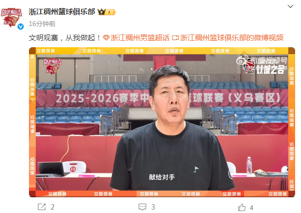 浙江男篮官方发布视频,主帅丁伟、球队核心吴前与外援约克一起,发布文明观赛联合倡议。