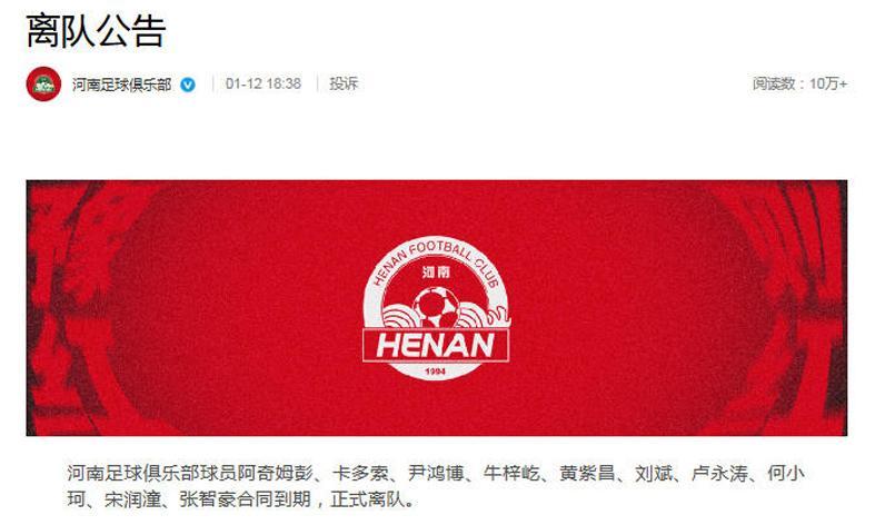 1月12日,河南俱乐部官宣,球员阿奇姆彭、卡多索、尹鸿博、牛梓屹、黄紫昌、刘斌、卢永涛、何小珂、宋润潼、张智豪合同到期,正式离队。这也是引发了球迷热议。其中,尹鸿博属于正常退役,转型当教练去了。阿奇姆彭、卡多索、黄紫昌、卢永涛、牛梓屹都走了,体系需要重建!